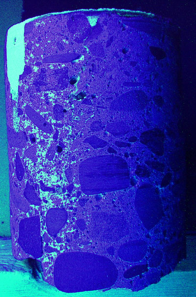 Concrete core sample of Concrete Mender repair viewed under ultra violet light.